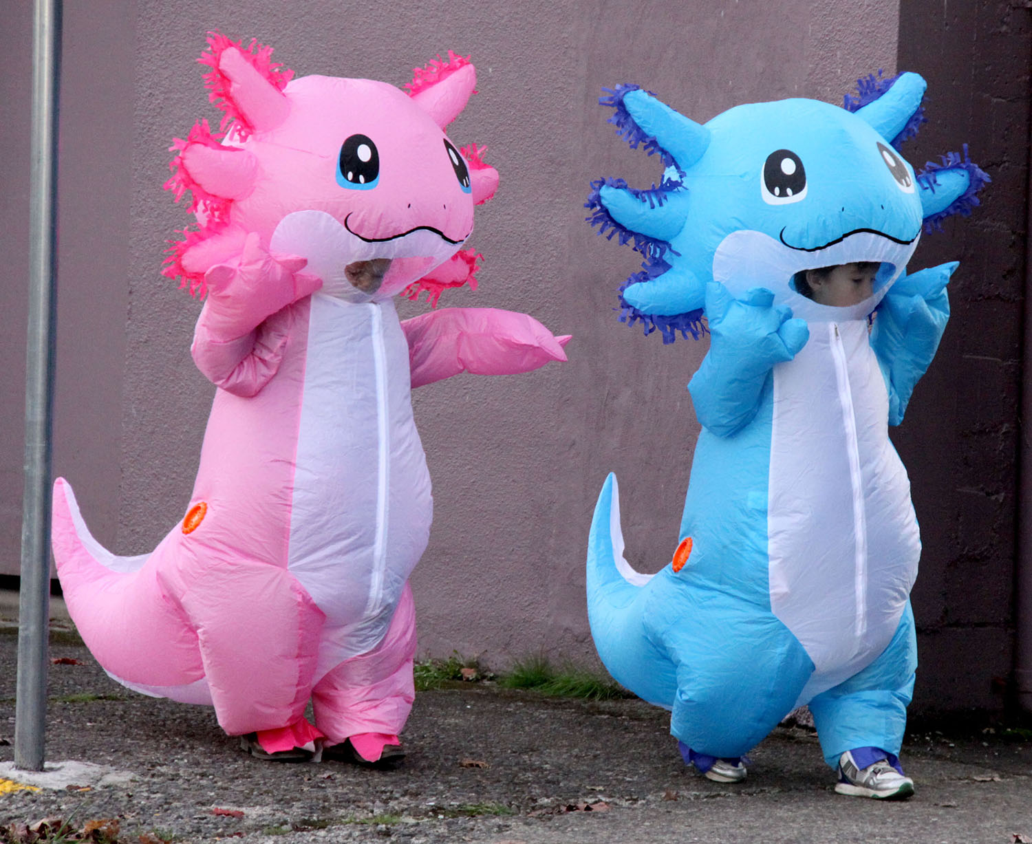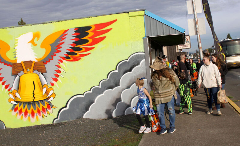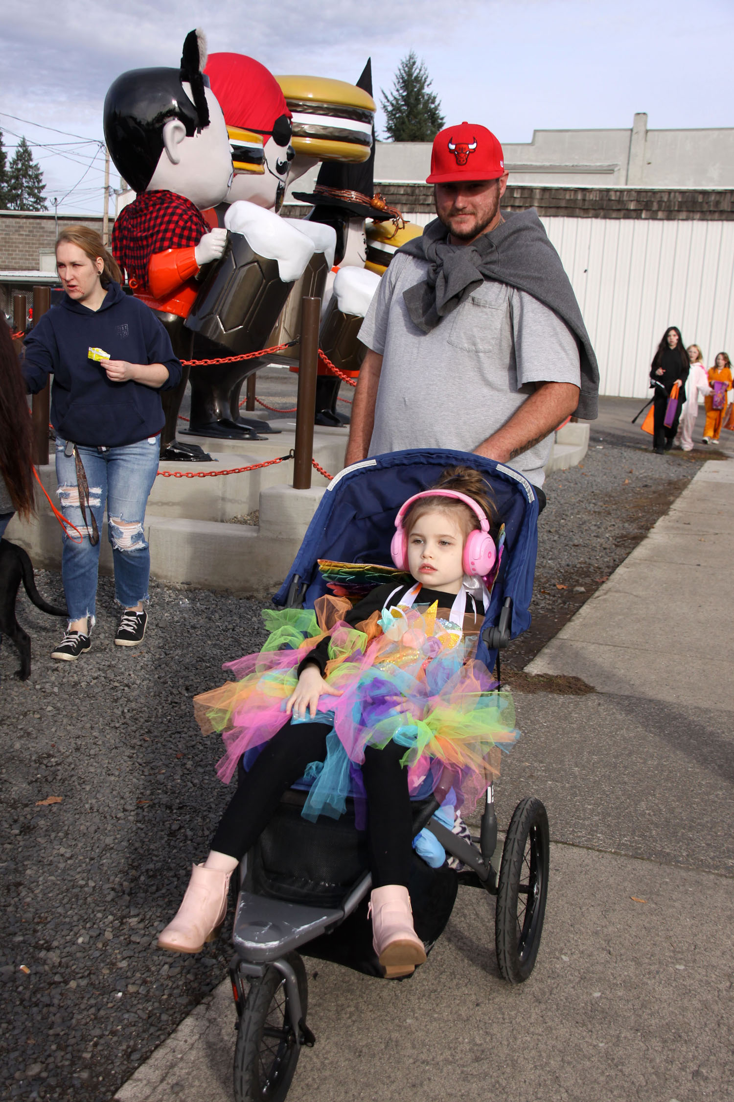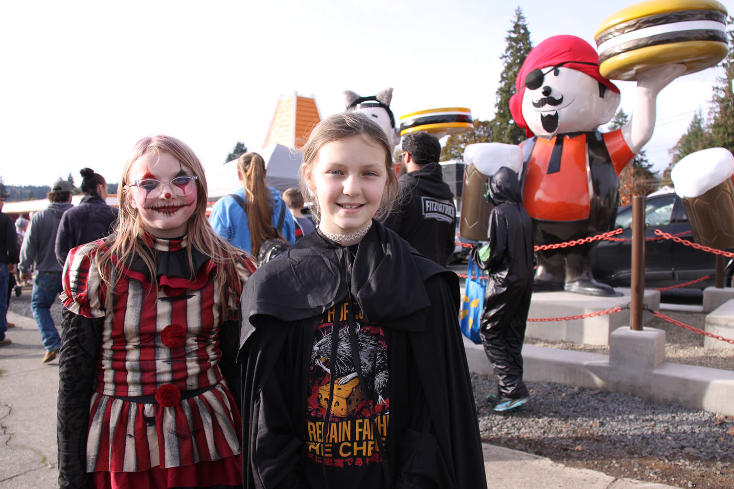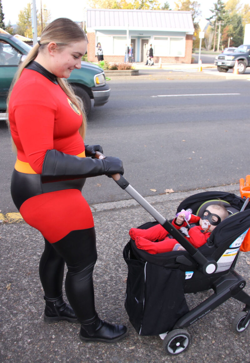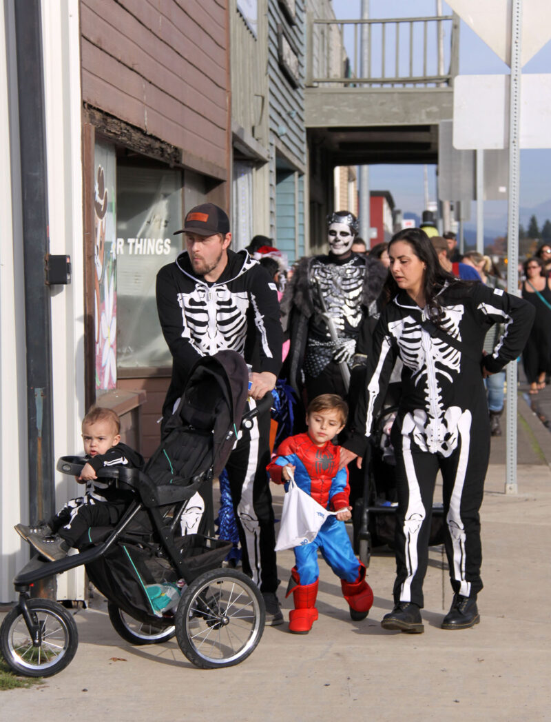 Paula Newman, left, owner of Figaro’s Pizza, hands out candy as a long line of trick or treaters await the goodies on Main Street. Photos by Scott Swanson
