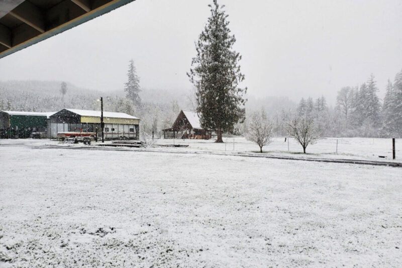 April showers came in the form of snow Sunday morning in Cascadia and other higher-level spots near Sweet Home. Reader Marie Stokes shared this photo shot from her front porch. More snow is possible later this week.