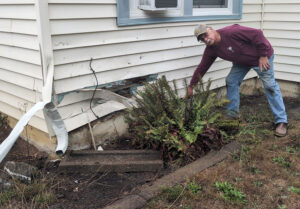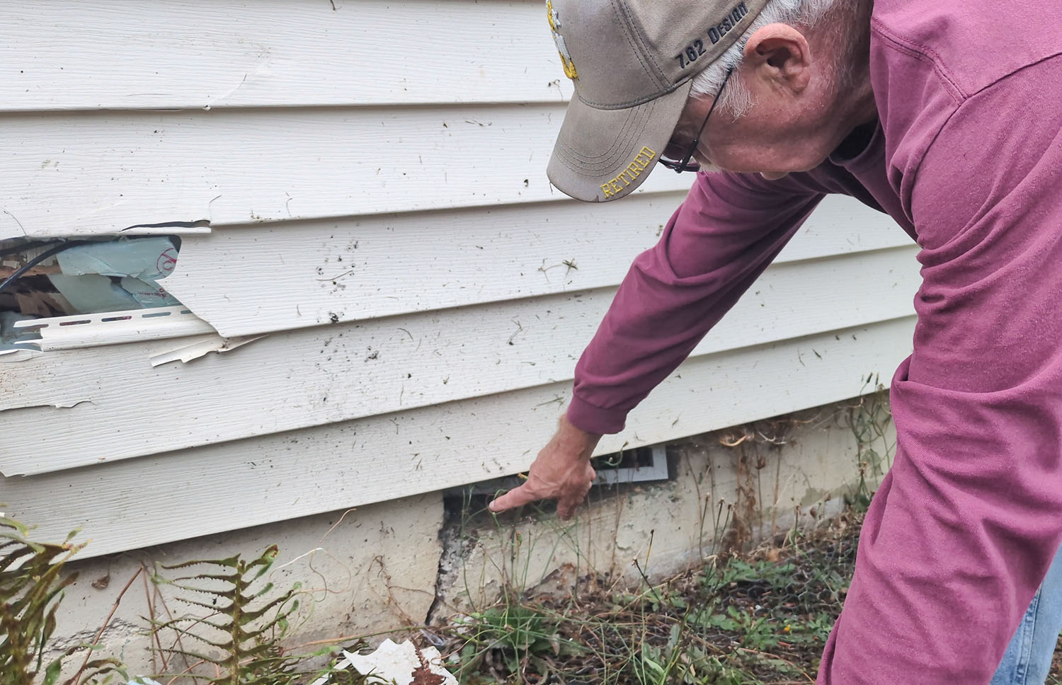 The foundation of the house was broken on each side of the corner, and the wall sustained damage.