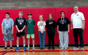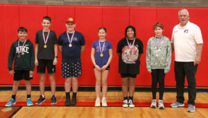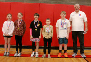 Top placers in the 8-9 age division are, from left, Elene Moe, second, and Charleigh Dixon (Hawthorne, winner), and for the boys, Rayden Samson (Holley, winner), Sam Chalker, third, and Porter Walker, second. Contest Director Randy Classen is on the right in each photo.