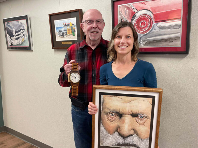 Clem and his wife are square dancers. The Oregon Federation of Square Dance Clubs issued a challenge to design the cover for its 2021 directory, and one of Clem’s pieces on display was selected. He later donated the painting for auction, where it sold for $600 and was loaned back for the exhibit.