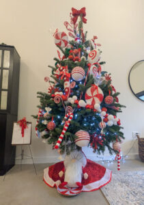 CONNECT Linn County’s “Whimsical” tree, on display at Jenna Stutsman Hybrid Real Estate, features a candy cane striped palette.