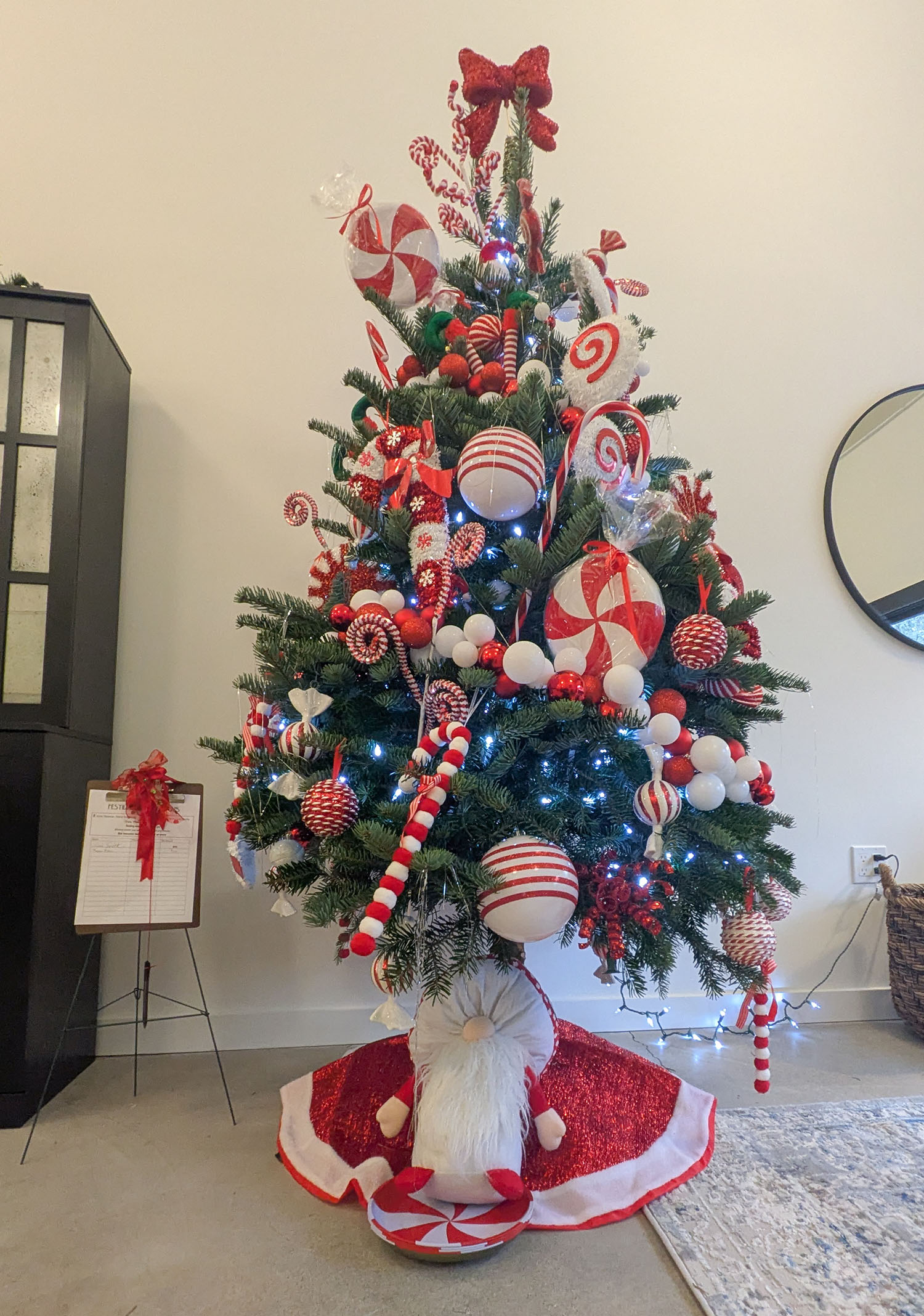 CONNECT Linn County’s “Whimsical” tree, on display at Jenna Stutsman Hybrid Real Estate, features a candy cane striped palette.