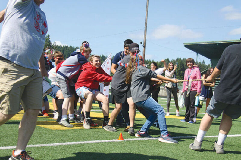Sweet Home Junior High students compete in a tug-of-war during their Field Day Thursday, June 15, at Husky Stadium