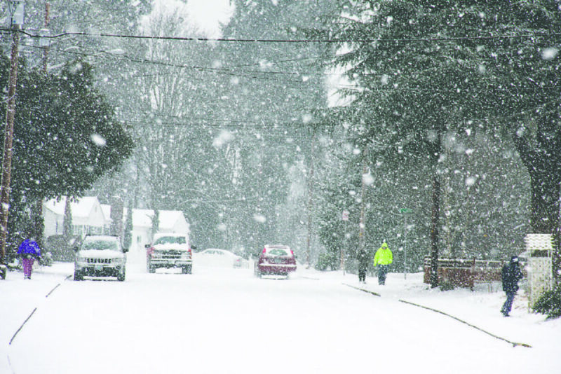 Oak Terrace is a busy place Saturday morning, Jan. 7, as residents turn out to enjoy falling snow. Sweet Home’s first significant snowfall this winter arrived to the delight of most of the kids in town and even some adults, who enjoyed the white stuff – before it turned to freezing rain later in the day and left an icy sheen that prompted officials to close local schools Monday morning.