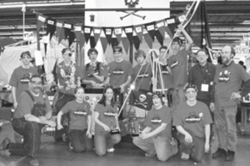 The FIRST Robotics Team that I am active in is also recognized as Boy Scout Venture Crew #308. As a part of Scouting, Team #1359 maintains a strong year round co-ed program that includes other non-robotic outdoor activities, such as rafting and camping. Typical activities for members each year involve fundraising, recruiting new members, visiting schools or community groups to spread the message of FIRST, community service, and of course, attending the Robotics Competitions. Team Scalawag boldly flies a Jolly Roger flag hoisted atop the pirate ship mast as part of the attention-grabbing pirate theme carried out in every aspect of our team, including our pit staging area, team member shirts, and even the robot itself.