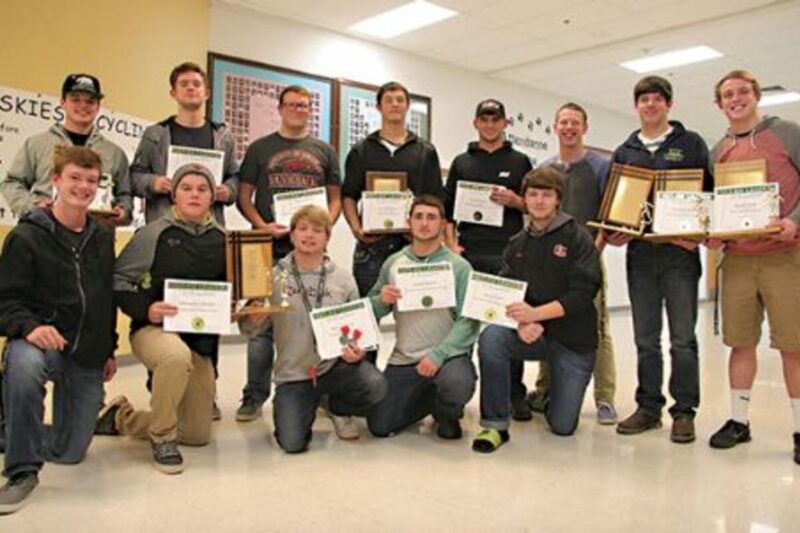 Huskies named to the Sky-Em All-League team are, in front, from left: Ryan R. Adams – Second Team All-League Receiver, Defensive Back; Chris Melcher – Second Team All-League Offensive Center; Ryan J. Adams – Second Team All-League Running Back, Defensive End; George Rayborn – Honorable Mention All-League Defensive Tackle; and Kevin Seiber – Honorable Mention All-League Linebacker. In rear, from left, are: Cole Ashcraft – First Team All-League Linebacker; Patrick Bell – Second Team All-League Offensive Tackle; Eric Whitlow – Honorable Mention All-League Offensive Tackle; Brycen Mitten – First Team All-League Tight End, Second Team Defensive End; Brett Blachley – Second Team All-League Offensive Guard; Eric Flierl – football, First Team All-League Receiver, Honorable Mention Defensive Back; Brandon Keenon – First Team All-League Running Back, Linebacker; and Hunter Jutte – First Team All-League Defensive MVP, First Team All-League Slot Receiver, Defensive Back and Punter, Second Team Return Specialist. Not present for the photo were: Justin Tow – Second Team All-League Quarterback; and Shawn Worthen – First Team All-League Defensive Tackle.