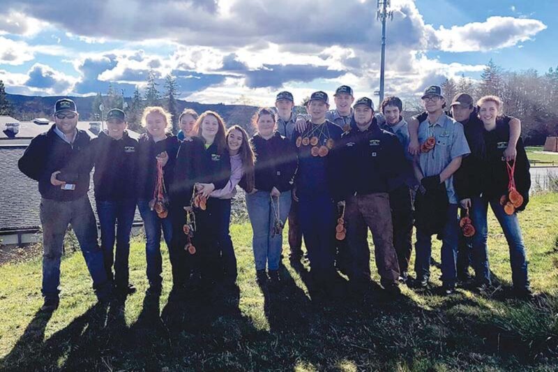 Sweet Home Forestry Club members won their first competition of the spring season on Saturday, March 3, at Knappa. In addition to the team’s win, Callie Baker won Overall Jill and Zech Brown won Overall Jack. Pictured, from left, are Instructor Austin Hart Instructor, Instructor Niki Stafford, Callie Baker, Denae Pennington, Sam Mitchell, Lacey Wilson, Shelby Rousey, CJ Mitchell, Zech Brown, Christian Black, Justin Myronenko, Andrew Fox, Dacotah Pennington, Colin Owens, Luke Shiffert, LaceAnna Shiffert. Not pictured are Alexis Hanna, Nakeetah Wilson. This wasn’t the Huskies’ first competition of the school year. In October they won the Scio competition, with Baker winning Overall Jill and Shiffert Overall Jack. In November they competed at Tillamook, winning that competition as well, with Baker once again taking the girls’ championship and Brown the boys. Sweet Home will host its annual competition at 9 a.m. Saturday, March 10, between the baseball field and the tennis courts on 18th Avenue. The public is welcome.