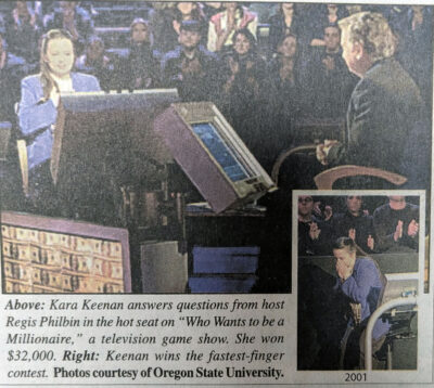 Sweet Home’s Kara Keenan, 31, walked away with $32,000 after playing on the show “Who Wants to be A Millionaire?” Fighting sleep deprivation, slight illness, a three-hour time change, nervousness and details of appearing on camera, she made it to the hot seat across from Regis Philbin. She lost a chance for $64,000 when she incorrectly identified the part of a spider’s body that makes the silk webbing.