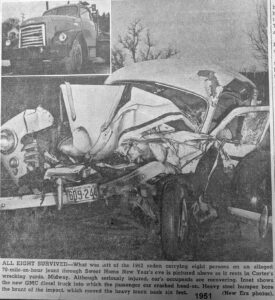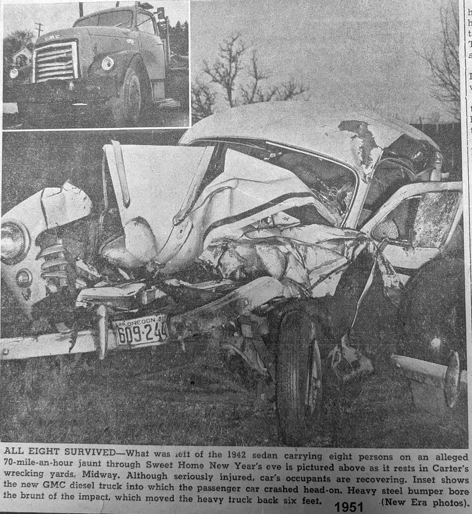 A 1942 sedan driven by Wendell A. Moore, 25, of Holley, and carrying seven passengers was crushed after it met with a parked GMC diesel truck on M Street. All eight were injured, but are reported to be coming along well. Police reported Moore was clocked at driving 70 mph before the car skidded and crashed into the truck.