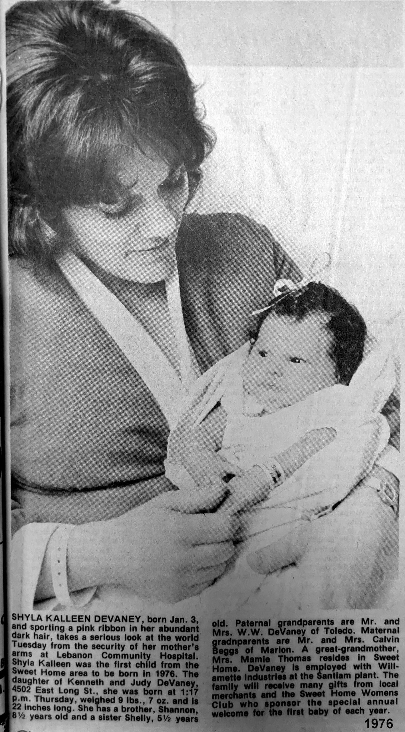 Sweet Home’s first baby of the year is Shyla Kalleen DeVaney, born to Judy and Kenneth DeVaney. She was born at 1:17 p.m. on Jan. 3, weighing 9 lbs., 7 oz. at 22 inches long.