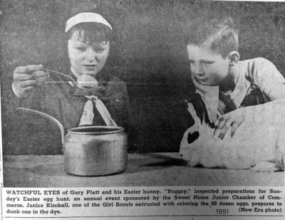 Nearly 300 youngsters are expected at the third annual Easter egg hunt, sponsored by the Sweet Home Junior Chamber of Commerce. Four Easter bunnies will be awarded the two boys and two girls who gather the most eggs in the wooded area west of the Oak Heights playground.