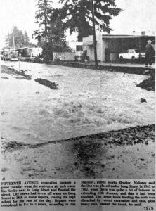 Excavation on 15th Avenue caused some stir when the stub on a six inch water line broke next to Long Street and flooded the street. Water had to be cut off to make repairs, and high school was closed for the rest of the day. The line was placed under Long in 1961 or 1962 when there was interest in extending 15th Avenue. Excavation and heavy rains disturbed the thrust block holding the stub enough to cause the flood.