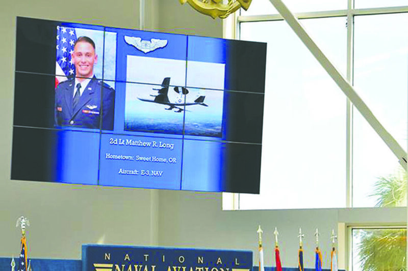 Air Force 2nd Lt. Matthew Long, a member of the Sweet Home High School Class of 2011, graduates from Combat Weapons School in ceremonies held at the Naval Aviation Museum, after two years of training at the Naval Air Station, in Pensacola, Fla., on April 14. A relative of a staff member at The New Era, who lives in New York, happened to be walking by when she heard the words “Sweet Home” announced. She turned and saw Long’s name on the monitor and photographed the occasion. Long is an aviator on a Boeing E-3 Sentry, commonly known as AW in Oklahoma City, Oklahoma ACS, an airborne early warning and control aircraft, based out of Tinker AFB in Oklahoma City, Okla. He is engaged to 2012 SHHS grad Jasmin Yoder, a nurse. Both of Long’s brothers, older brother Jason, an Air Force pilot, and fellow triplet Patrick, a Marine lance corporal, are in the miltary and their triplet sister Katelyn is married to a Navy ensign, said their mother, Katrina Long of Crawfordsville.