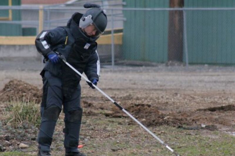The Explosives Unit responded, and a police officer and member of the unit dug a hole in the grass nearby, southwest of the grandstands. A member of the unit suited up and picked the grenade up with a pole device. He carried it to the hole and covered it, so it could be detonated safely and rendered safe.