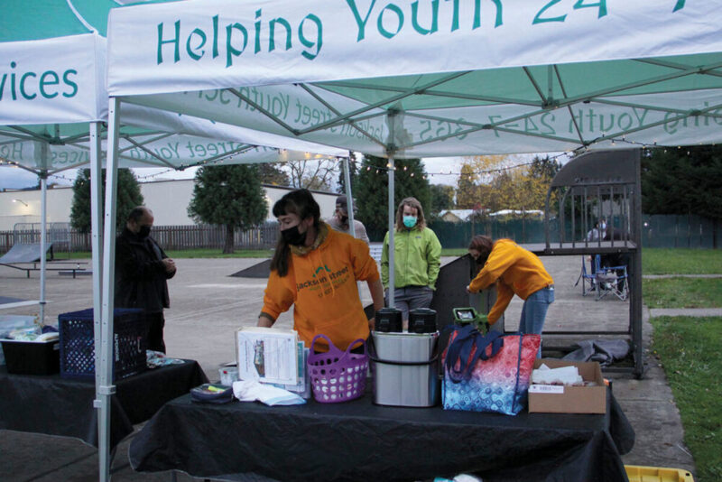 Kate Hemlock, an intern at Jackson Street Youth Services, sets up a table with hot meals, hot chocolate, winter supplies, COVID-19 bags, and snack bags to be handed out to needy youths ages 10-24 at the organization’s Skatepark After Dark event at the Sweet Home Skate Park on the evening of Oct. 28.