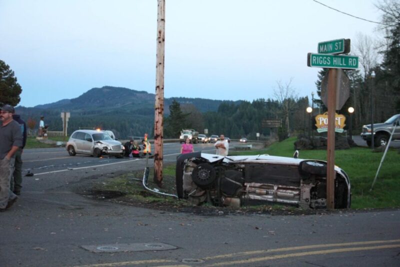 MEDICS assist a driver at the scene of a two-vehicle crash that blocked HIghway 20 at Riggs Hill Road. Drivers and a passenger complained of minor injuries. No one was transported to the hospital. Linda Massey, 57, was arrested for driving under the influence. Driver Kate Hawken, 16, was westbound on Highway 20 turning left onto Riggs HIll Road in a 2010 Volkswagen Jetta. Massey was eastbound in a 2007 PT Cruiser on Highway 20 when Hawken’s vehicle turned across her path, flipping Hawken’s car onto its side. Hawken’s sister, Torree Hawken, was a passenger in her vehicle. Sweet Home police are continuing an investigation into the crash. They responded to the crash at 4:35 p.m. Thursday. Below, firefighters prepare to flip Hawken’s car onto its wheels.