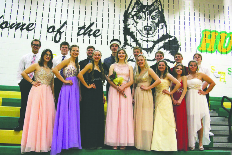 Members of Sweet Home High School’s 2016 Homecoming Court are, at left, from left: Brandon Vasfaret, Ellie Davis, Ricky Yunke, Ally Tow, Josh Rice, Bethany Gingerich, King Nathan Hager, Queen Chloe Newport, Sean Wolthuis, Lauren Yon, Wesley Parker, Kendall Stutzman, Keegan Holly, Alayna Davis, Jackson Lynn and Liz Chelstad. Above, Hannah Jewett, center, checks on teacher Dave McNeil’s progress in a contest in which participating relay teams drank as much soda as possible through a straw in a brief span of time before switching off. Below left, staffers deliver a performance of “Y-M-C-A” to entertain the crowd. Below, students stand round the traditional bonfire after snaking through the streets in the Serpentine event.