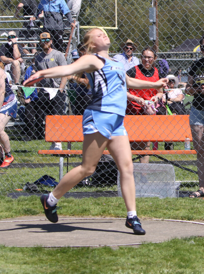 Discus – (1 Hadley Hughes (Dayton) 129-5; (2) Kasey Zuidema (Crosshill Christian) 120-11; (3) Lucy Oien (Knappa) 110-4; (10) Maci Modderman (ELCA) 94-4; (13) Sydney Dominy (SH) 88-1.