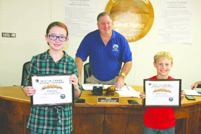 APPEARING with Mayor Greg Mahler at the City Council meeting on May 23 are the winners of the annual If I Were Mayor contest Marlys Lowry, left, for an essay and Thomas Lee Davis for a poster. Their entries have been submitted to the statewide contest.