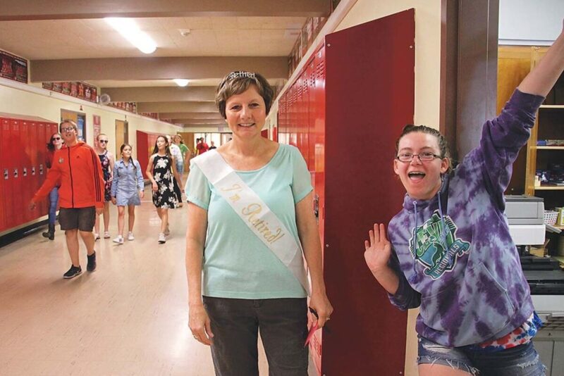 Sweet Home Junior High secretary Toy Royer, center, celebrates her last school day on the job, here with student Taryn Abbott, right. Royer retired in June after 30 years on the job.
