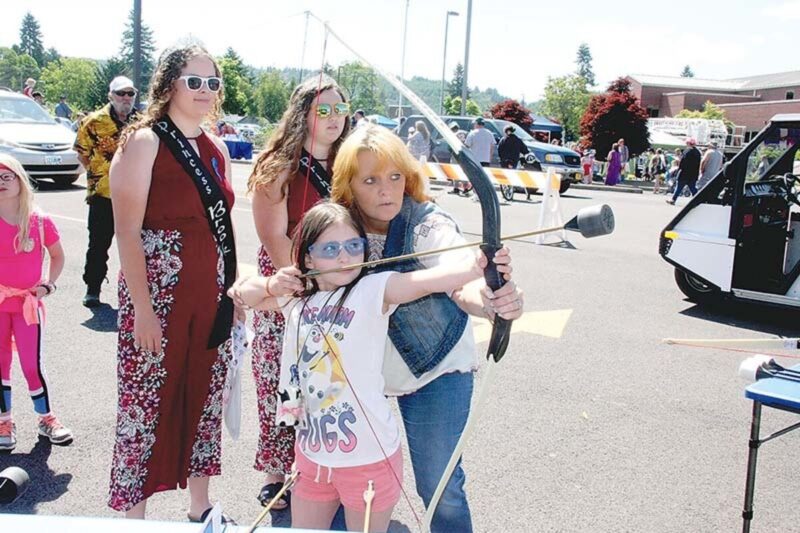 Miranda Chelstad, 8, center, aided by Kimi Nash, takes aim at a target during an archery activity at the Sweet Home Public Safety Fair Saturday, June 22, in the Police Department parking lot, as Sportsman’s Holiday princesses Brook Womack, left, and Makayla Griffin. At bottom, Brayden Bowen, 9, tries to walk a straight line in a simulated field sobriety test overseen by School Resource Officer Geoff Hamlin. The simulation uses goggles designed to distort vision.