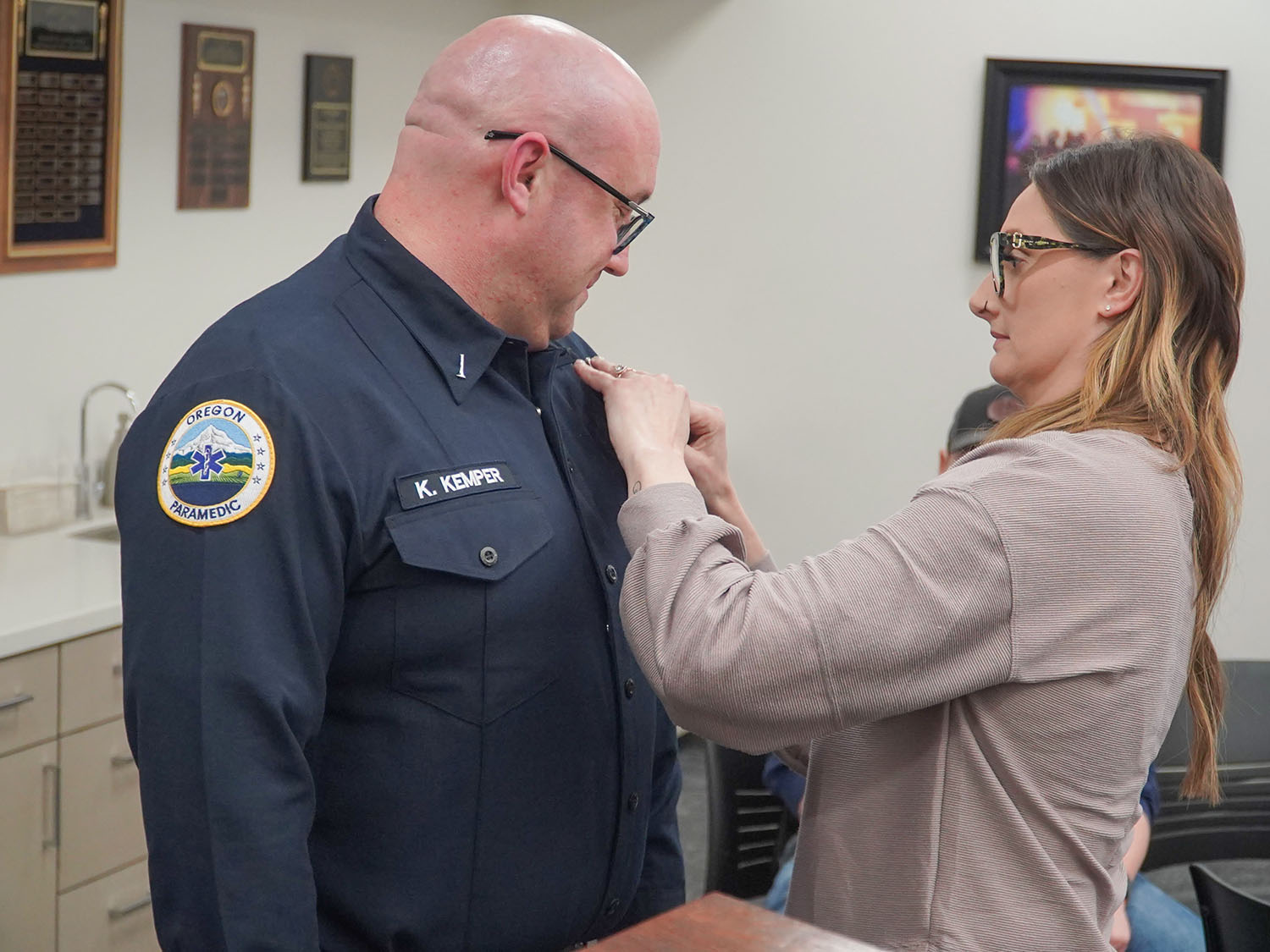 During a mass badge-pinning ceremony on Feb. 10, firefighter Kyle Kemper was out responding to a call and was unable to be officially pinned by his family. The board took the opportunity during their March 10 meeting to recognize Kemper, who was promoted to lieutenant.