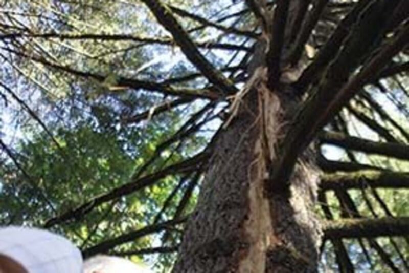 Debris from the tree was everywhere, even on the chair where Connie usually sits. Twenty-foot limbs were sheared off the tree, on which a long spiral scar runs from the broken top, where the bolt struck, to the ground, where the electric charge punched holes beneath the tree.