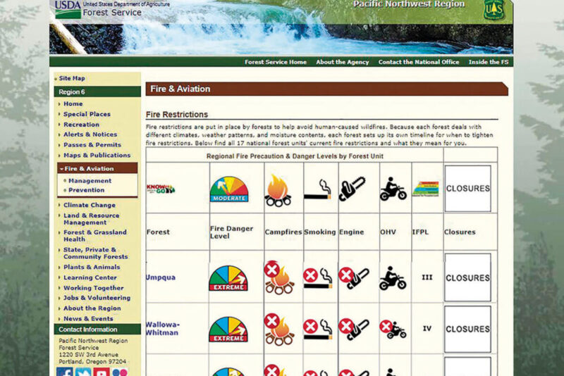 Website visitors will find current fire information and usage restrictions for all National Forests in Washington and Oregon on one page, in an easy-to-use, at-a-glance format.