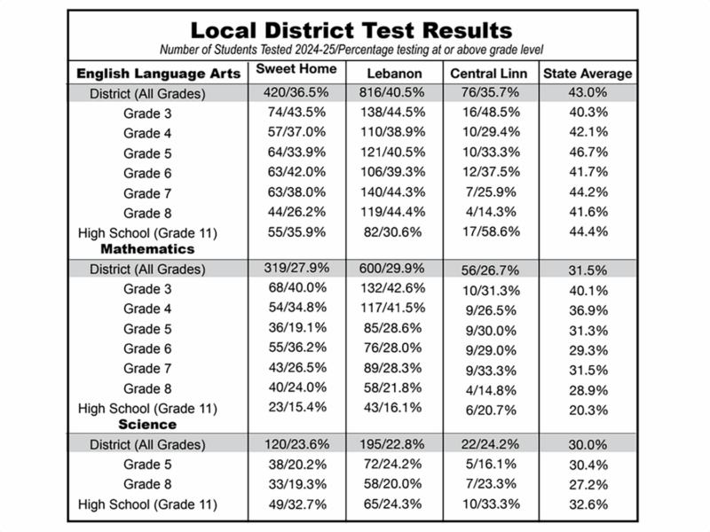 In Central Linn, 35.7% of students in all grades tested at or above grade level in English, 26.7% in math, and 24.2% did so in science. By far, Central Linn’s 11th graders scored the highest in English, with 73.2 testing at a proficiency level. The district-wide numbers for this year represent small increases from 2022-23 and 2023-24, though districtwide math scores increased more than 5% between 2022-23 and 2024-25. Central Linn’s scores have fluctuated as much as 5% 10% over the past three years, but the number of students taking the tests is much smaller than larger districts, so individual students’ performances can have a greater impact on the final numbers.