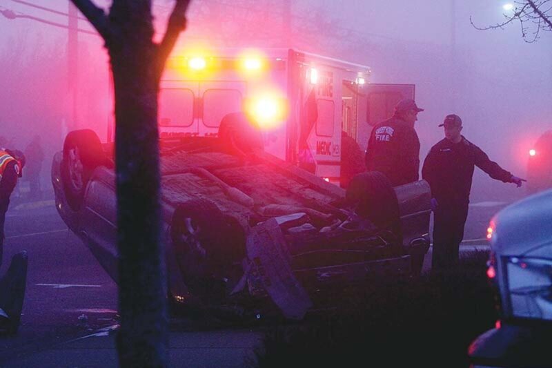 Police Officer Ryan Cummings collects information at the scene of a single-vehicle crash Monday morning, Feb. 12, in front of Sweet Home High School, 1641 Long St. Police Chief Jeff Lynn said the driver reported that the vehicle veered suddenly toward the side of the road and flipped. The vehicle had two passengers, a female adult an a 3-year-old child. The driver, Ryan Sechrest, 31, was cited for driving while suspended and driving uninsured. Police are seeking witnesses to the crash. Anyone with information is asked to call the Police Department at (541) 367-5181.