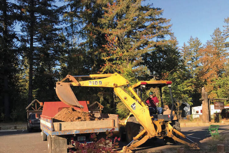 Cascadia resident Roy Stokes, right, in main photo, breaks ground for new mailboxes that will be installed at the U.S. Forest Service Day Use Area at Short Bridge on Highway 20. Work began last week on the project, which will restore local delivery to residents not served by the rural route, who have had to drive to Foster to pick up their mail since the Cascadia Post Office burned down in 2011. In the second photo, from left, County Commissioner Will Tucker, Jeff Sims of the U.S. Forest Service, and Jim Gourley inspect the location for the new mailboxes.