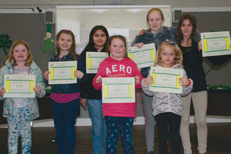 Students honored with ESPY Awards at the March School Board meeting include, from left, Harlee Bellon, kindergarten, Foster; Annabelle Mengore, fourth grade, Holley; Kianna Furst, seventh grade, Sweet Home Junior High; Zoe Krebs, first grade, Oak Heights; Emma Davis, fifth grade, Charter School; Ruby Barber, kindergarten, Oak Heights; and AvaMarie Gaspard, fifth grade, Charter School. Also honored but not available for the photo were: Josh Aker, sophomore, Sweet Home High School; Abbigail Banker, second grade, Hawthorne; Noah Branter, kindergarten, Foster; Kandace Claunch, eighth grade, SHJH; Kylee Crawford, fourth grade, Hawthorne; and Oly Horner, senior, SHHS.