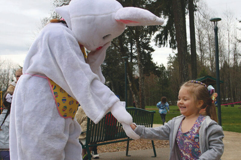Kenzlee Brown of Sweet Home interacts with the Easter Bunny at an Easter Egg Hunt sponsored by the Sweet Home Rotary Club at Sankey Park on Saturday, April 8.