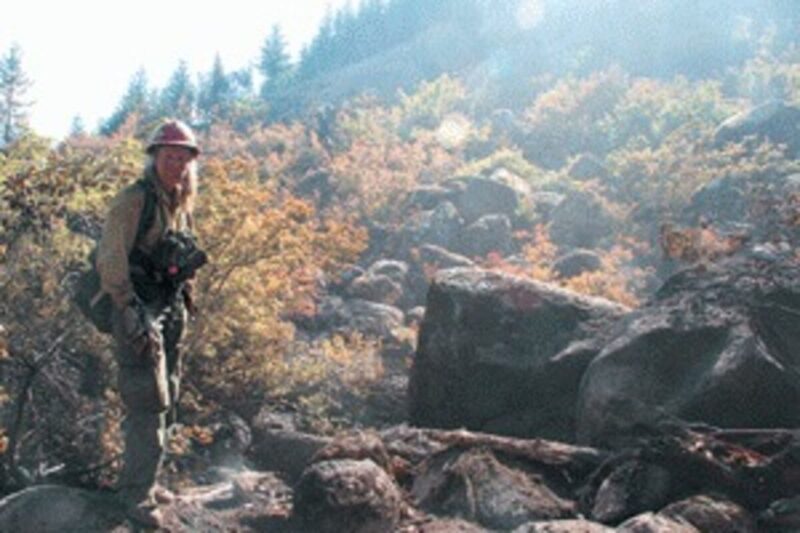 Crew members Charles Urbank of Canyonville, who’s been a firefighter for two years, Matthew Spencer of Glendale (five years) Eugene Hopkins of Canyonville and Brad Yeats (16 years), were working on a pile of debris Sept. 11, the day before many crews, including Timberline, were demobilized. They were working downhill from the boulder patch following another crew along the fire line.