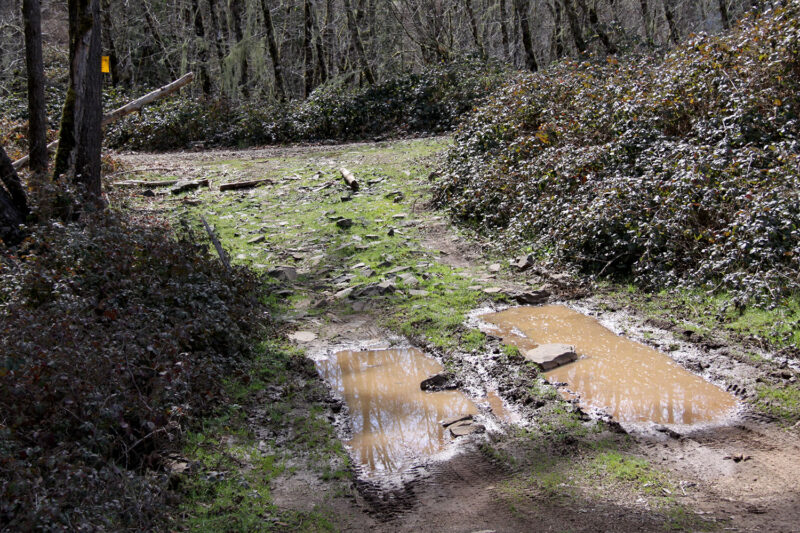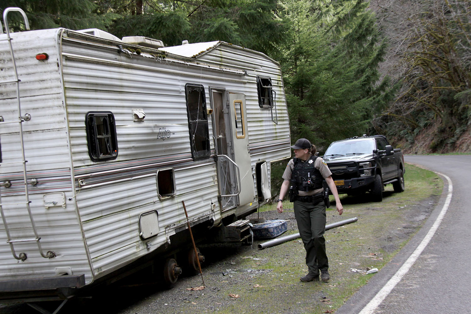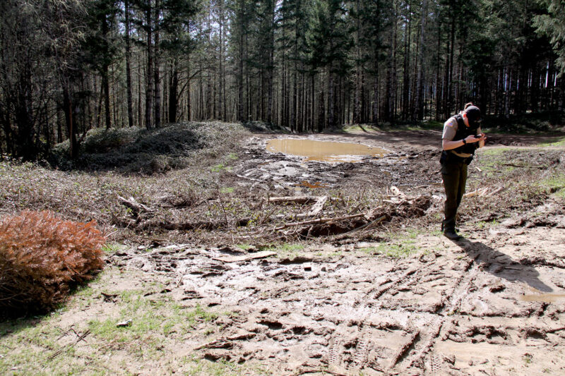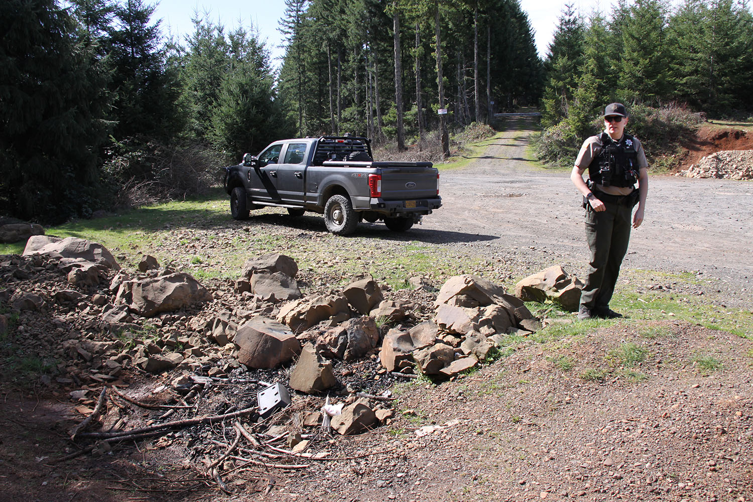 In front of the Linn County Sheriff’s mountain deputy is a large, obviously deep, puddle. Trash is everywhere – cans, wrappers, ammo casings, pieces of pallets, along with charred remainders of bonfires. Up the road, stumps are scattered where people have been shooting at targets. Grooves in the muddy road show where trucks or ATVs have traveled around rock piles designed to block off the road.