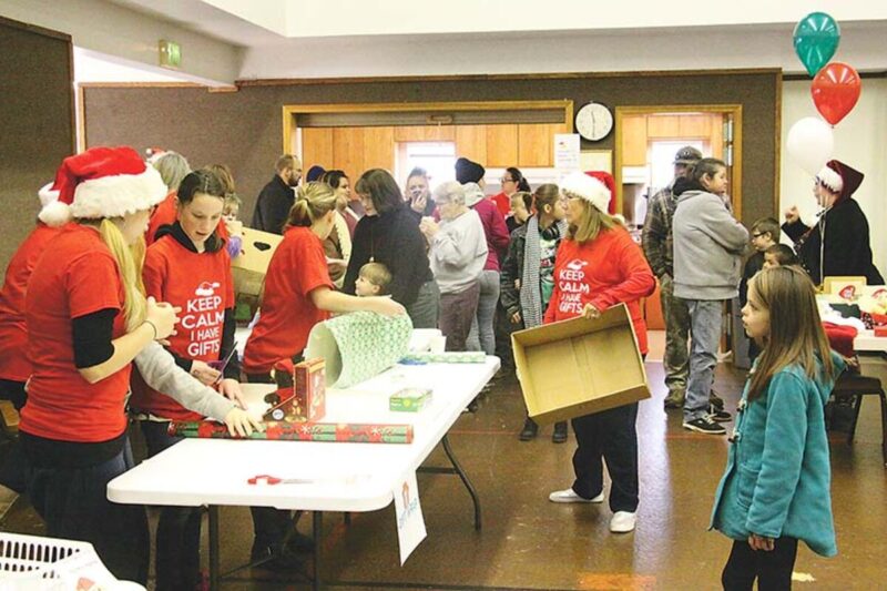 Organizer Nancy Patton said 145 children took home 737 gifts for family members. Twenty-six volunteers helped the children and wrapped presents. One was Linda Jones, who helps Dutch Bros. delivered hot chocolate and the Oregon Jamboree donated two three-day passes as a fund-raiser, for which tickets were sold Saturday at the event, Patton said.