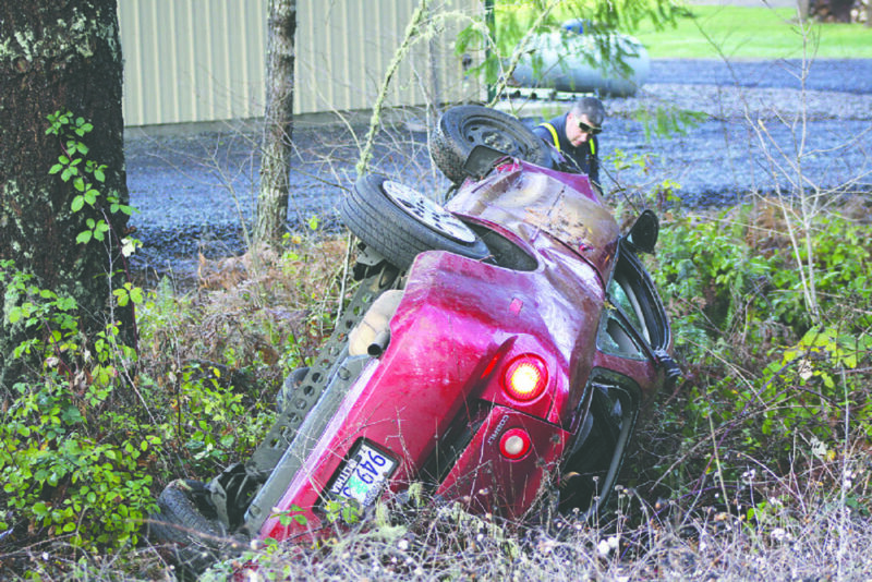 Medics, above, attend to victims in a rollover crash on North River Road at the entrance to Lewis Creek Park on Wednesday, Dec. 21. According to Sheriff’s Lt. Michelle Duncan, driver Kalyn Hagle, 24, hit black ice on the road and the car left the road and rolled. A Facebook post reported that it rolled five times. A passenger, Zachery Allen Mendoza, left, was transported to Samaritan Lebanon Community Hospital by medics. According to the Facebook post, another survivor was Hagle’s poodle, which was ejected during the crash and was found 300 feet away from where the car came to rest. Hagle was taken by private vehicle to the hospital as well, where she was treated and released. Duncan said Hagle was cited for reckless driving, fourth-degree assault and driving while suspended.