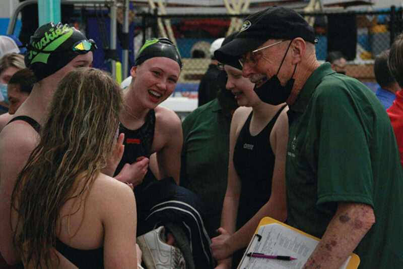 — Longtime Sweet Home swimming Coach Doug Peargin was honored for his 55 years on the deck, 48 of them at Sweet Home, following the season’s final home meet. He was lured into the Auxiliary Gym next door, where he received an award from the Oregon Athletic Coaches Association. Peargin’s career included 31 district titles in the past 25 years, four state boys titles and three girls state titles.