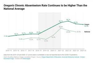 Attendance at Oregon public schools improved only slightly during the 2024–25 school year, and continued to lag behind the national average.