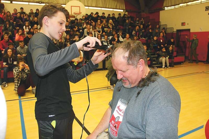 Augustadt said the school challenged the students to decrease the number of tardies. SHJH has implemented tardy sweeps between classes, Augustadt said, and it dramatically cut the number. The students met a challenge, and Augustadt lost his hair. Afterward, students played a “Fear Factor” game, torturing each other for fun with a variety of disgusting food, mixing, chili, Sweet Tarts, tuna fish, peanut butter and more. Many volunteered, and five students were selected to give the delicacies a try.