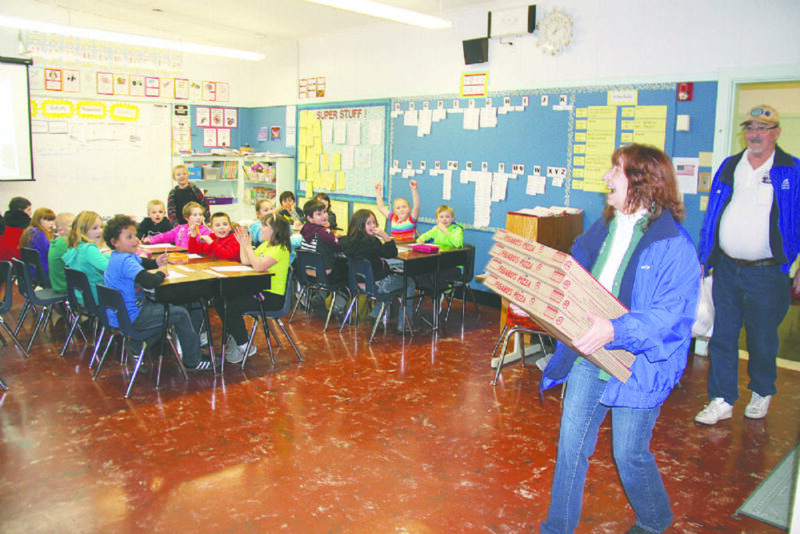 Surprised and delighted students shout, “Pizza!” and cheer as Sweet Home Elks Leading Knight Charly Bashaw, above, carries pizza into Gwen Philipsen’s second-grade classroom at Oak Heights. She is followed by Al Bashaw. Charly Bashaw helps serve pizza to the students. The Bashaws were joined by Exalted Ruler Barbara Rossin delivering the pizza party to the classroom Thursday, Jan. 12. They also gave pencils and “honorary Elks” stickers to students, who collected food for Christmas food baskets made by the Elks Lodge. Philipsen’s classroom brought about 40 more items than any other classroom at Oak Heights. The school collected more than 1,000 food items in a drive organized by Mindie Medina’s sixth-grade class.