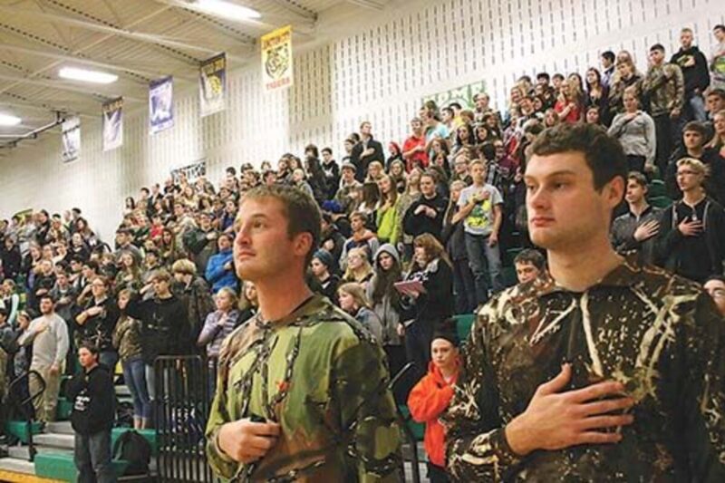 Teachers Ryan Graville, center and Drew Emmert, decked out in camouflage, listen as student Mary Rouse sings the national anthem during a Sweet Home High School assembly Thursday, Nov. 5. Students and teachers made a point of wearing camo that day to honor the memory of Matthew “Mattie” VanBrocklin, who drowned in the South Santiam River while fishing on Oct. 29. Principal Ralph Brown led students in a moment of silence in VanBrocklin’s honor before the anthem.