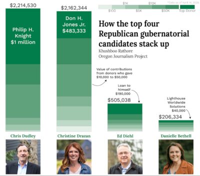The top four Republican candidates for Oregon governor are headed to their first debate on Thursday, April 16, in Hillsboro. At this stage, the two front-runners have raised the most money, thanks to huge contributions from wealthy patrons. Here’s a breakdown of the campaign finances for the four, as of April 14.