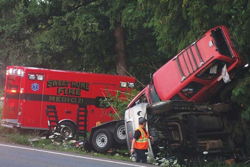 According to Oregon State Police, a GMC Denali driven by Connie Miranda Shimon, 25, of Junction City, was pulling a trailer carrying a Toyota Four Runner when it fishtailed on a curve, causing Shimon to lose control. The direction of travel was not clear from the police reports, but the vehicles ended up in a pile on the south side of the highway, taking out some trees and a sign.