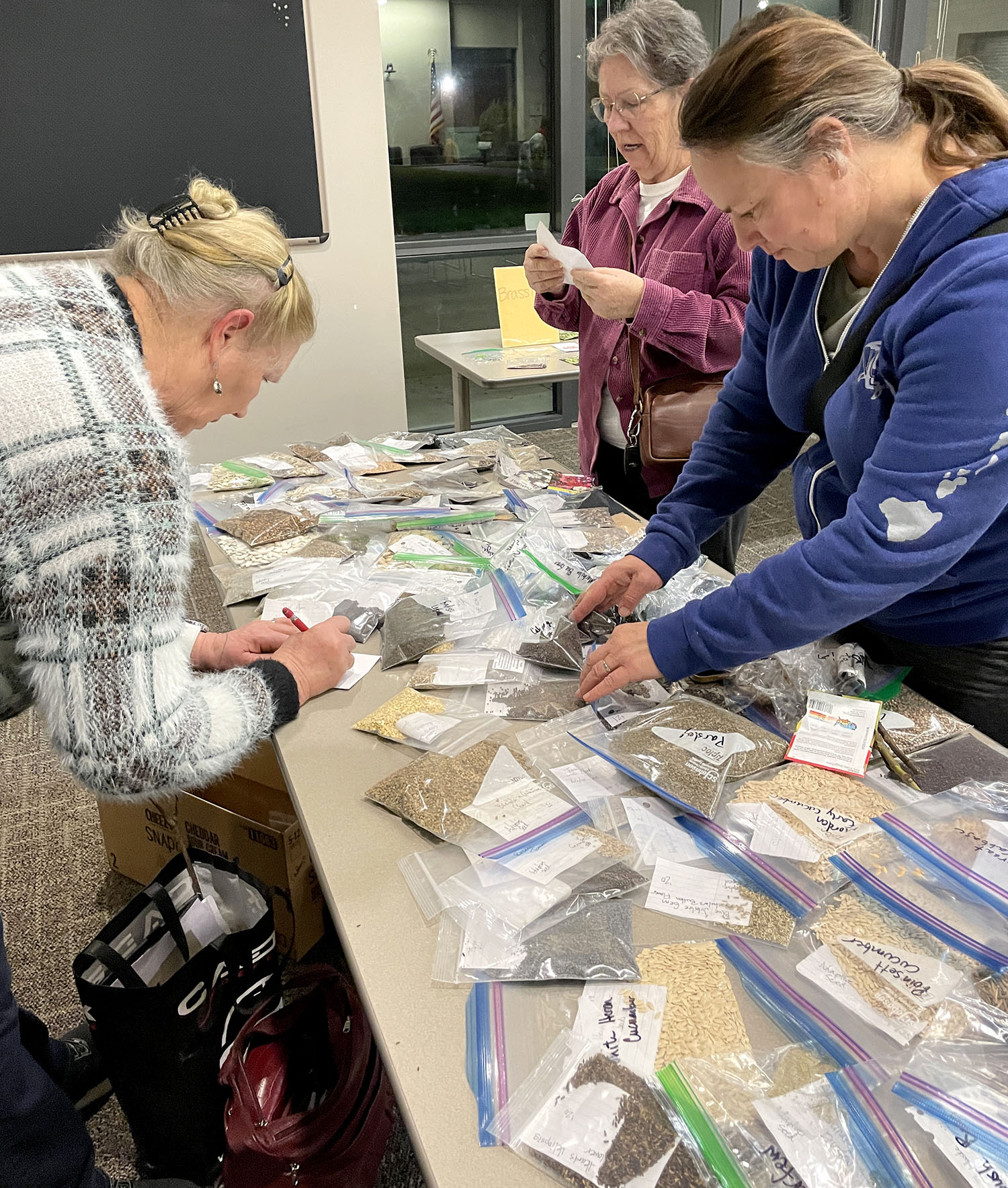 Participants in the Santiam Food Alliance’s Seedy Tuesday, at left, sort through seeds contributed to the event, which was held Feb. 17 at the Lebanon Library. The annual seed swap and gardeners’ gathering included a presentation on unusual vegetables by Linda Ziedrich and a Master Gardeners’ advice table and an information table staffed by the Lebanon Garden Club.