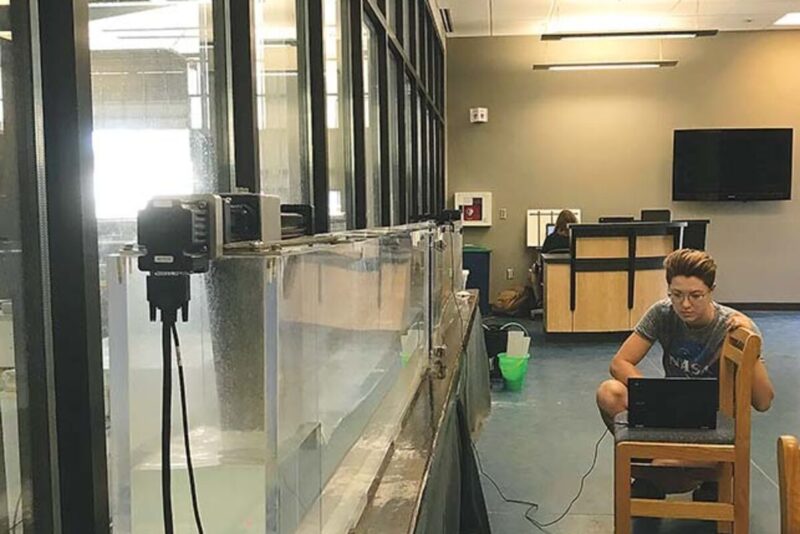 Both Snyder and student Megan Hager, a senior this fall, spent several weeks during the summer at the O.H. Hinsdale Wave Research Laboratory at Oregon State University. By conducting research and designing lesson plans for high school classes, they earned a grant that allowed them to purchase a 16-foot wave flume for Snyder’s classroom.