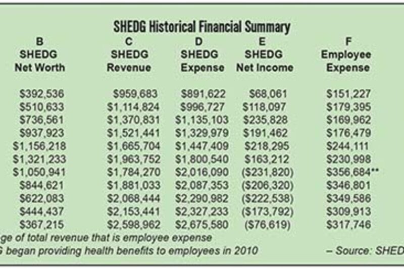 The board also reviewed a spreadsheet of SHEDG’s financial history.
