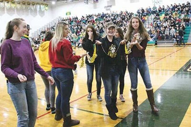 Friday, Nov. 3, was the real kickoff assembly for Sweet Home High School’s canned food and penny drive, as well as its entry into the football playoff bracket. At left, Leadership students, from left, Anna Coleman, Samantha Coats, Shahaylee Erickson, Aliyah Boss, Marissa Kurtz and Ashley Farthing carry duct tape strips loaded with change donated by students and teachers for the penny drive, which will buy turkeys and other items not collected in the canned food drive, which ends Thursday, Nov. 9. The penny drive runs through Nov. 17.