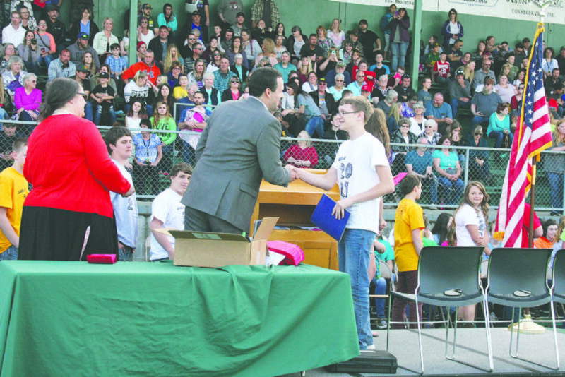 Eighth-graders, above, line up to receive their certificates during Sweet Home Junior High School’s annual Eighth-Grade Celebration Promotion Ceremony on June 14 at Husky Stadium, marking their completion of junior high and promotion into high school. at right, on top, Stanley Blank receives a certificate and class photo from Vice Principal Andy Price. At right center, math teacher Lisa Canaday instructs students as they prepare to step onto the stage, and, at bottom, eighth-graders Kailey James, left, and Maren Weld emcee the program.